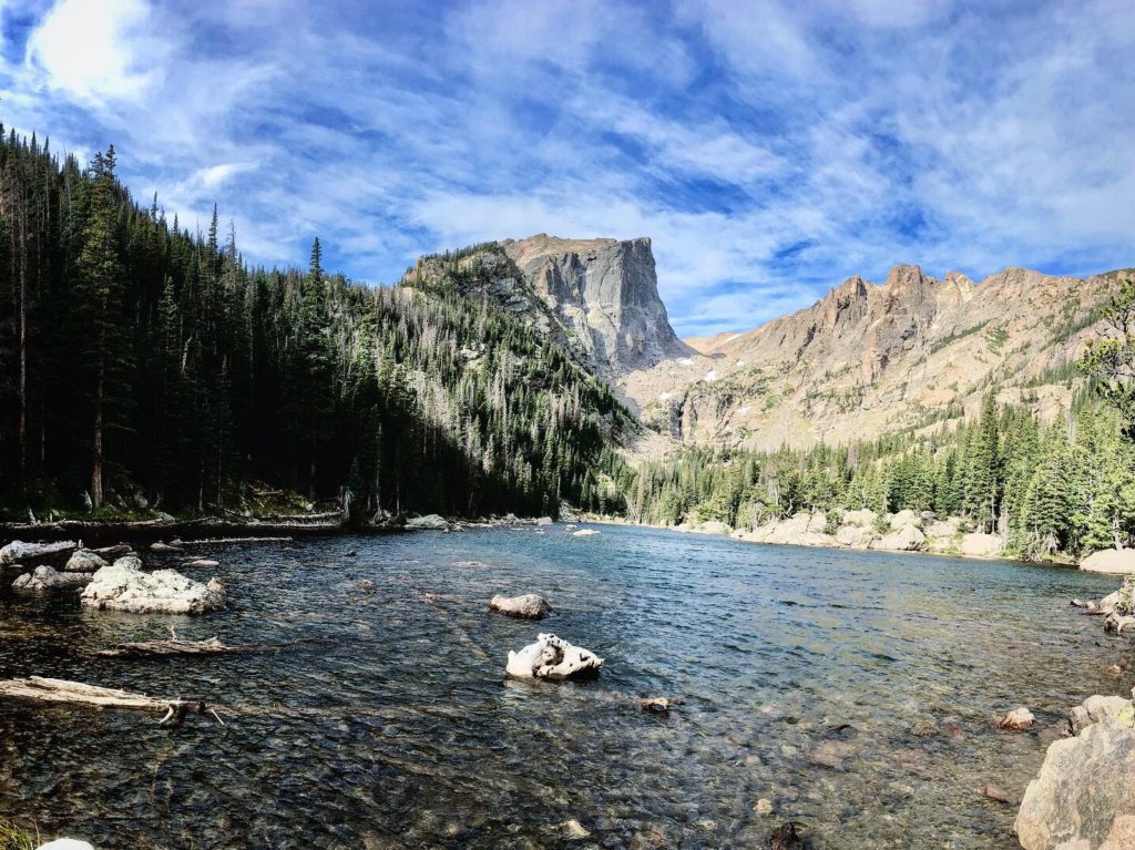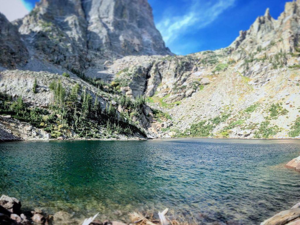 From here, it’s 0.8 mile to reach Loch Vale ( 6 mile round trip from Glacier Gorge trailhead, moderate). The trail became quite steep and there’s several switchbacks on the way to Loch Vale. Once you reach Loch Vale, look closely into the lake, and you will able to spot some trout. Also, look for Taylor Glacier which is straight across from the lake.