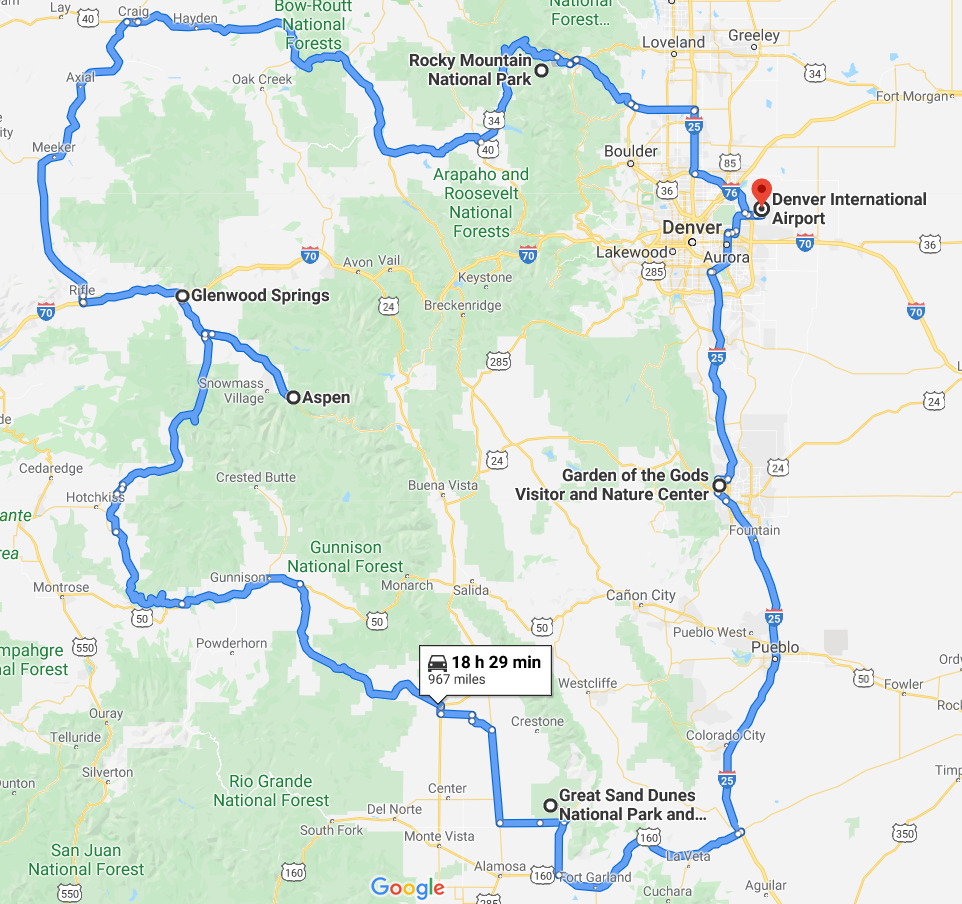 Last year we headed to the state of Colorado and had a successful week long leaf peeping trip🍁! Below is a map which roughly summaries our trip route. We flew to Denver where we rented our car for the week and headed toward our first stop, Rocky Mountain National Park. From there, we stopped by Glenwood Springs area to pay a visit to the beautiful hanging lake. Aspen is our third stop where we explored the Maroon Bells and independence pass area (Note: if you plan to travel from Oct-May, this road is closed). We then drove toward Great Sand Dunes National Park and had a fun sandsledding experience for the first time 😊. Garden of Gods is our final stop where we saw some interesting rock formation.
