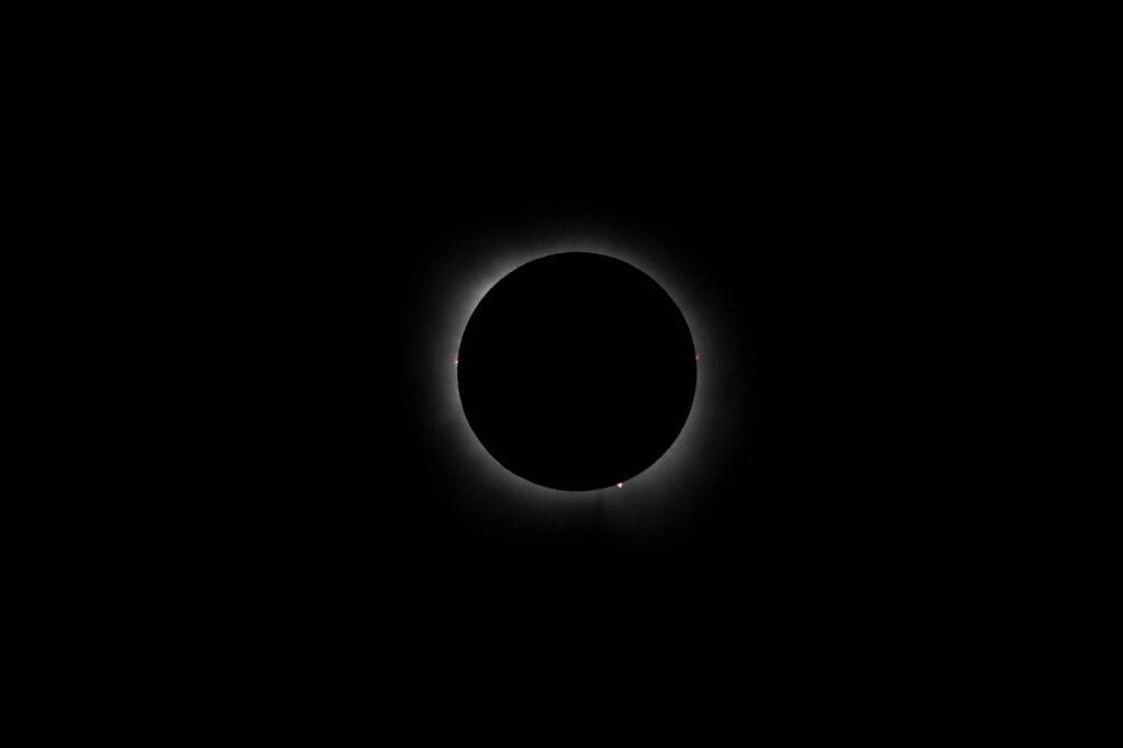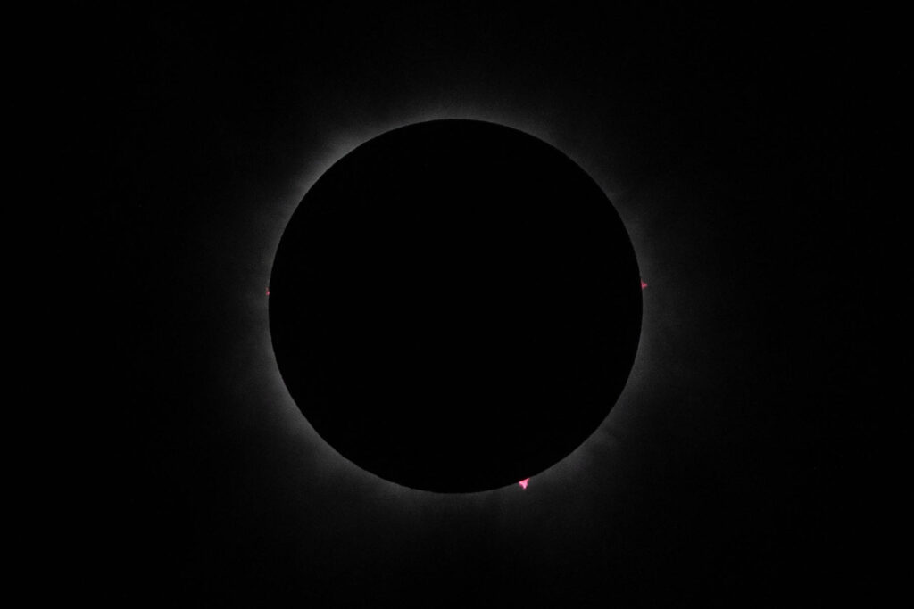 At the moment of totality, glasses and lens filters were removed, and all the watchers around us begin to cheer, then the gasps and awe began to set in. I thought everything would be pitch black, but it was a dull dusk. Looking up into the sky, it seemed like the clouds parted at the point of totality because the sun’s corona streamed through very clearly, unlike earlier in the eclipse where we waited in-between cloud cover. I wanted to see how the local wildlife was responding, but there were too many excited people exclaiming for me to tell how they might have reacted. I didn’t mind, it was amazing.